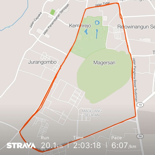 Bad decision pagi itu: Nggak bawa duit buat beli minum karena ngiranya sekali puteran cuma 3.5 kilo, muter sekali dan bisa pulang dulu. KM 12 udah nggak kuat lagi, harus cari minum ini. Akhirnya pas lewat bank BRI ada pos satpam saya mampir dulu buat minta air minum. Baru habis itu saya lanjut lari. Masuk ke lap kedua, saya sudah menempuh 15.4 kilo. Masih ada 5.4 kilo lagi buat dapet 20.18K. Akhirnya saya lanjut lari sampai sekitar 2 kilo lalu puter balik sampe dapet 20.18 kilo. Akhirnya saya finish 20.18K dengan waktu 02:03:18. Not bad.