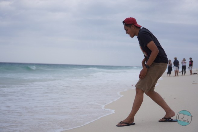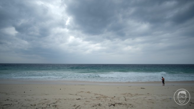 Sampai di Pantai Mananga Aba, dan cuma kami ber-13 ditambah Helmi dan tiga orang driver kami. Sepi bangeeet. Pantai ini pasirnya putih kecoklatan halus dan nggak terlihat karang-karang. Langit siang itu mendung, air laut jadi berwarna biru tosca pucat.