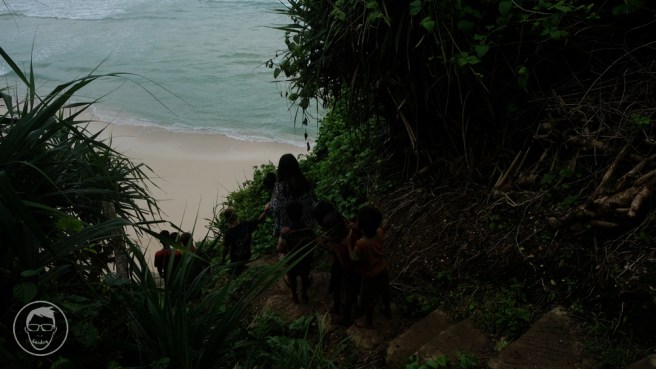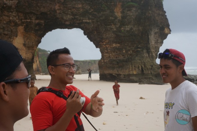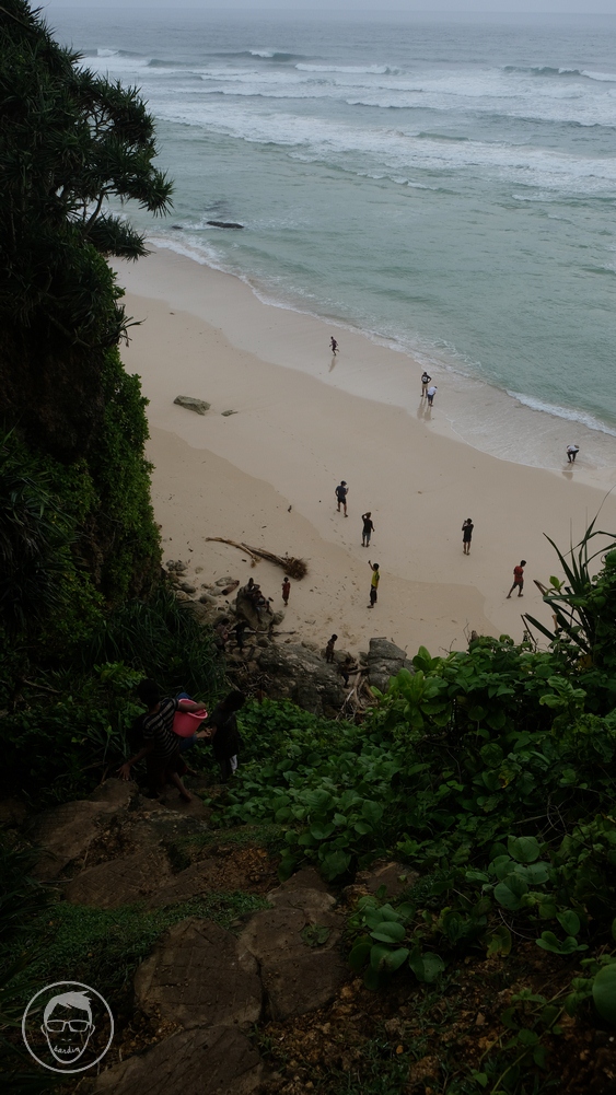 Susah payah kami menuruni tebing, sedikit-sedikit pantai yang kami tuju makin terlihat. Kami sampai di Pantai Mbawana! Karena mulai gerimis kami berteduh mengamankan barang-barang biar nggak kehujanan. Pantai ini pasirnya haluuuus, warnanya coklat teraaaang. Mungkin karena agak mendung ya. Kalo pas terik, saya yakin warna pasirnya jadi putih terang.