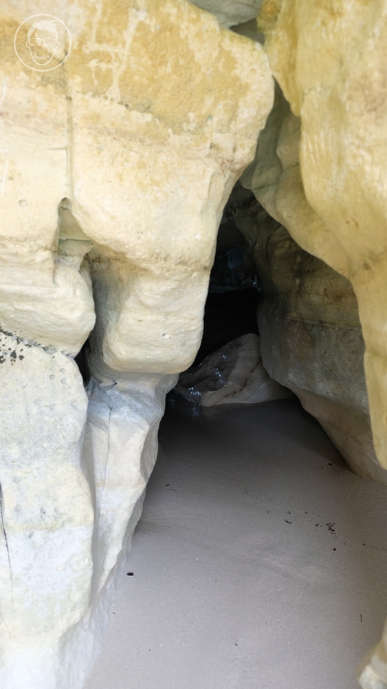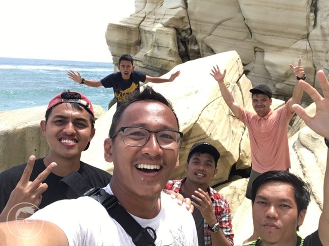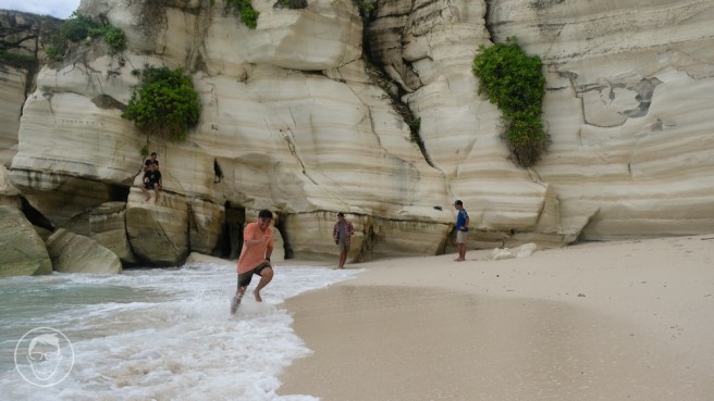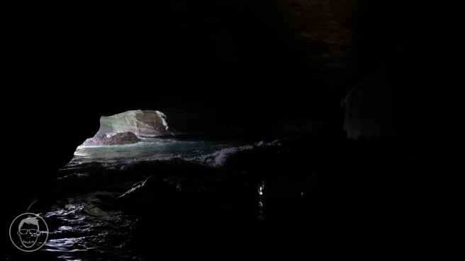 Dan eits. Ada goa di bawah tebing bebatuan ini. Karena pintu goanya relatif sempit, jadi pastikan kalo mau masuk adalah saat air laut sedang tidak pasang dan ombaknya tidak ganas. Di dalamnya ada goa lebar, juga terdapat mulut goa yang menghadap langsung ke laut lepas. Jadi ada ombak yang langsung datang dari mulut goa. Jadi hati-hati ya gaes.