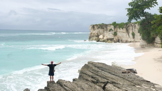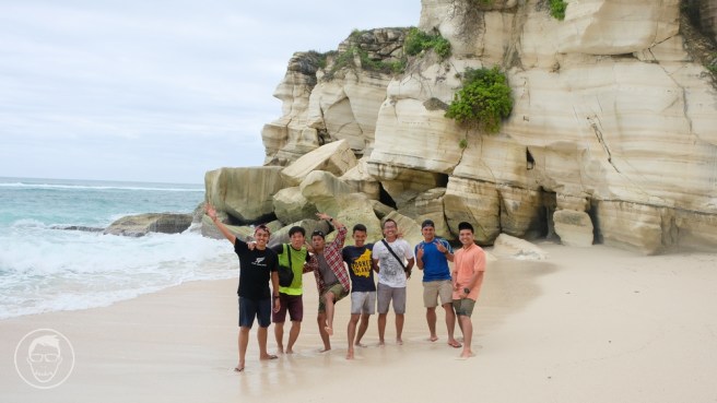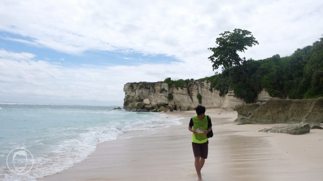 Pas kami sampai langit cerah, pasir putih yang terpantul cahaya matahari menyala berwarna coklat muda terang, tebing-tebing batu dengan warna senada mengelilingi pantai indah ini.