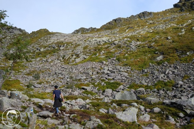 Untuk saya yang punya badan dengan fitness level ala ala, menurut saya hiking di Mount Fløya dengan bonus Djevelporten punya hiking level: Hard. Sepanjang perjalanan adalah batu batuan curam, dan tanjakan tanah bercampur rumput yang sesekali bikin track nggak kelihatan. Ditambah lagi dengan kondisi sore itu sehabis diguyur hujan, menjadikan setiap pijakan harus bener hati hati. Karena berkali kali saya kepleset padahal habis dengan sok tegarnya nanyain ke salah satu cewek yang kepleset saat papasan sama kami, “You’re good? Please, be careful.” *trollface