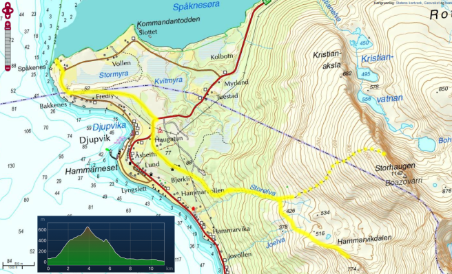 : Storhaugen: 1.081 meter dpl : Hammersletta: 295 (elevasi awal: 29 meter dpl – Main Trailhead, 8 meter dpl – Alternate Trailhead) |