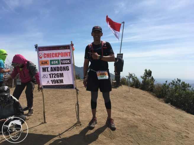 Sampai juga akhirnya di CP 1, di Puncak Gunung Andong! CP 1 berada di KM 19 dengan catatan waktu saya sekitar 4 jam 25 menit. Saya dapet gelang marking pertama untuk kategori 42K. Setelah beberapa kali foto, refill bladder air minum, saya langsung bergegas melanjutkan perlarian. Karena di WS 2 nanti, pada KM 23 di daerah Sedadap, diberlakukan CoT WS, jam 12:00. Masih ada 3 jam setengah lagi sih sebenernya. Untuk menghadapi 4 kilo dengan track turunan, saya yakin saya mampu tiba di WS 1 sebelum jam 12.00. Tapi, sebisa mungkin saya nabung waktu biar bisa finish sebelum jam 15.00. Karena saya nggak tau seperti apa medan yang akan saya lalui sampai finish.