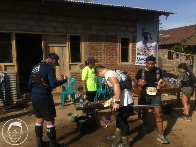 Sudah jam 1 siang, waktu tempuh sampai di CP 3 sudah 8 jam. Masih ada 9 kilometer lagi yang harus saya tempuh. Saya memutuskan untuk sholat dzuhur dulu di CP 3. Saya sempet nanya sama panitia di CP 3, ternyata saya nomor urut 26, dengan urutan pencatatan saya dicatat pertama dari pada Mas Ari dan Mas Mas dari Bogor ini. Bagi 20 finishers pertama, bakal dapet jersey dari Hoka One One warna putih dengan logo biru dan jargonnya di punggung, “Time to Fly”. Keren sih, keknya pun masih bisa nyalip 6 orang di depan saya. Asalkan saya bisa duluan berangkat ketimbang dua orang ini. Tapi karena saya mau sholat dzuhur dulu, akhirnya saya malah disalip sama dua orang ini. Hahaha, yowis ben.