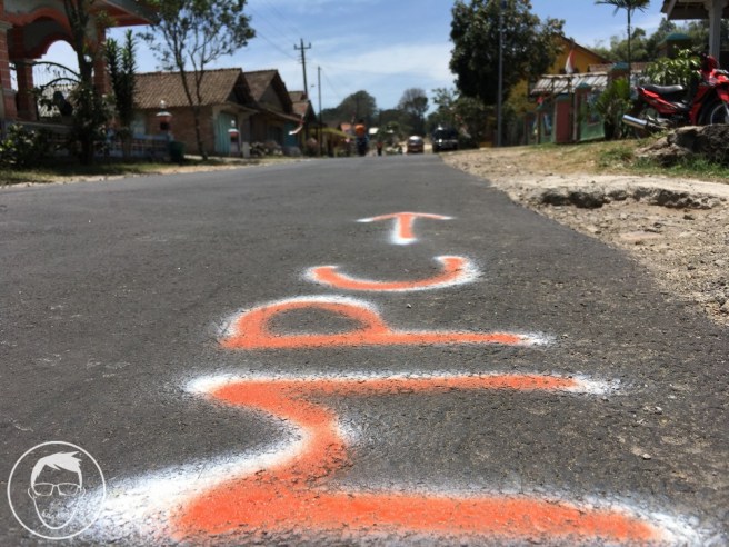 Masih jam 11an dan panasnya udah nggak keruan. Di tambah aspal yang panas, saya sendirian mencoba tetep konsentrasi karena takut kelewat marking dan kesasar. Marking kali ini berupa tulisan dari car semprot berwarna putih dan oranye.