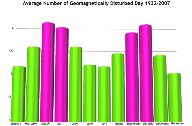 Ohiya, menurut artikel yang saya baca di aurorahunter, dari 12 bulan yang dipantau, ada empat bulan yang termasuk “the most geomagnetically disturbed days”: Maret dan April saat spring time, serta September dan Oktober saat autumn.