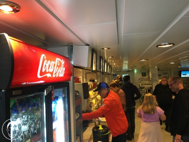 Setelah urusan tiket selesai, kami langsung dipersilakan naik ke atas ferry. Luassss, lantai bawahnya untuk parkir kendaraan. Kami meletakkan tas-tas besar kami di loker lalu menuju lantai 2. Begitu kami masuk, seperti biasa, kami disambut aroma makanan yang sangat menggoda. Kami lapaaar, we want decent fooood. Tapi kami tetep teguh untuk berhemat. Terpaksa kami keluarkan roti tawar (lagi) dan Nutella (lagi) untuk menemani perjalanan kami ke Lofoten.