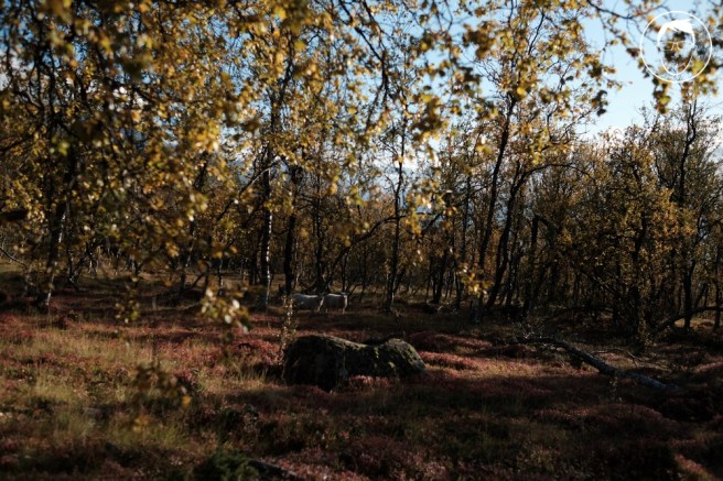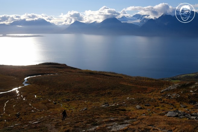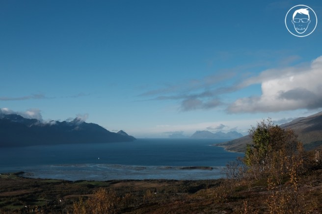 Kami lihat tumpukan batu besar di tengah ruang lapang, pepohonan terlihat coklat menyebar di bawah kami, terlihat jalan raya mengukir tepi fjord dan Lyngen Alps mematung di kejauhan.
