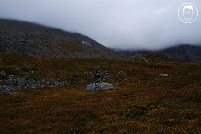 Sampai akhirnya mulai terlihat cairn besar. Ah, kami yakin itu puncak Storhaugen. Bersusah payah kami, dan akhirnya sampai di cairn itu. Menulis-nulis di logbook sebelum bersembunyi di tumpukan batu yang dibuat mengeliling. Kami bersembunyi dari dingin, dari angin yang bertiup pelan, tapi membawa udara super dingin. Kami membuka bekal, jam 13.45 kami makan siang sambil menggigil hebat. Tangan terasa beku, nasi sudah nggak keruan kerasnya, tapi karena emang udah laper banget, tetep aja kerasa enak.