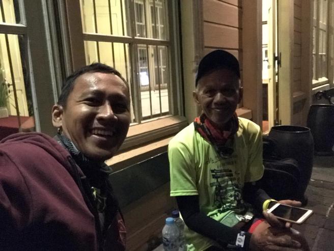 Flag off untuk kategori 65K tepat jam 22.00, saya berangkat dari rumah setelah beres sholat Isya, sekitar jam 19.30 saya naik ojol ke MesaStila. Mahal juga ternyata, 20 kilo lebih dan habis 53 ribu. Sampe di MesaStila masih jam setengah sembilan lebih. Beberapa temen ada yang nyewa kamar di rumah penduduk sekitar, agak jauh dari MesaStila jadi saya memilih buat nunggu di venue langsung. Dan udah ada Pak Ngatiman! Pak Ngatiman ini salah satu pelari yang menginspirasi saya. Usianya sudah 65 tahun, tapi larinya lebih hebat dari saya. Dua bulan lalu dia baru aja menyelesaikan Run to Care di Bali kategori individu. 150 kilo!