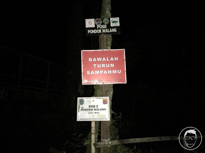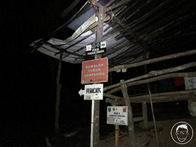 Kami bertiga sampai di Pos 1 pukul 02.05. Dari awal saat kami mulai berangkat dari Basecamp, diminta jangan ngebut-ngebut, kalau bisa nanti nunggu di Pos 9 dan summit bareng-bareng. Tapi dari pada kami nunggu kelamaan di Pos 9 nanti, jadi kami di tiap Pos bakal nunggu rombongan di belakang, kalau group paling dekat dengan kami sudah sampai, baru deh kami ngelanjutin pendakian.