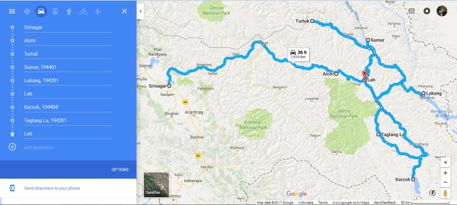 Trip saya dimulai dari kota Srinagar dan berakhir di kota Leh, kurang lebih seperti ini rutenya dengan total jarak perjalanan kurang lebih 1,510 kilometer.