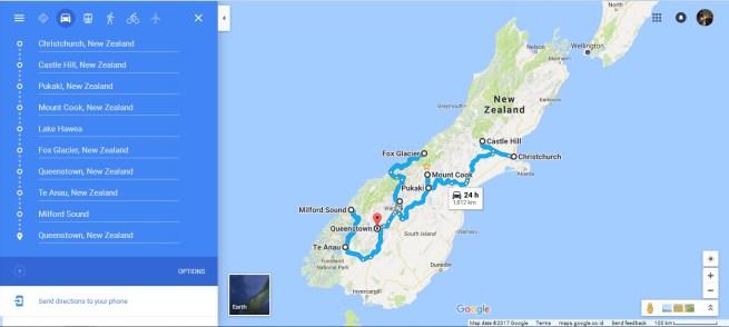Rute road trip kami adalah start dari Christchurch dan finish di Queenstown, kurang lebih kayak gini rutenya.